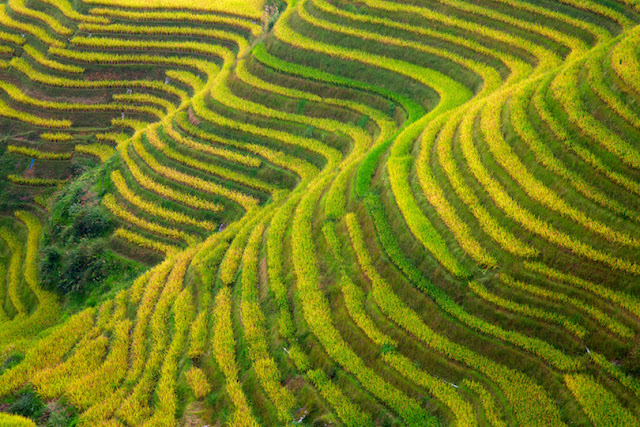 Ada sesuatu yang benar-benar spiritual tentang menatap sawah. Garis yang diukir di bumi itu halus dan matematis namun feminin. Dan semua karya seni ukiran bumi ini menghasilkan makanan pokok karbohidrat China - nasi. Sesuatu yang prima, jauh di lubuk hati, membuat Anda merasa nyaman dan damai dengan pemandangan yang Anda kagumi. Kolam di Longji Terraces dengan lembut memantulkan sinar matahari sementara telinga tanaman padi bersinar kuning saat panen. Teras padi itu seperti ampitheatre raksasa yang mengambil tanah lebih jauh dari yang bisa dilihat mata.